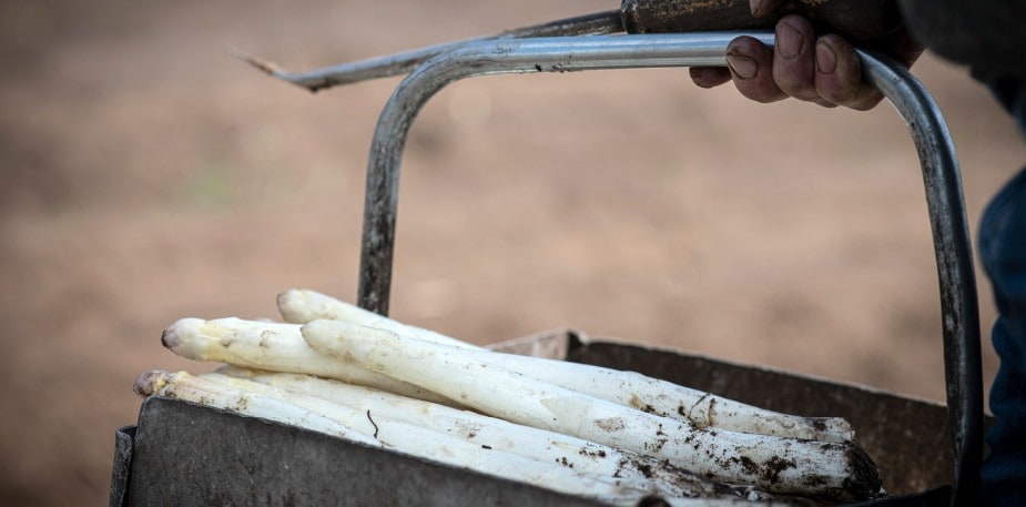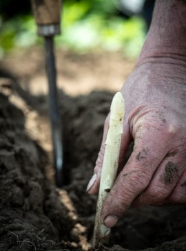 De aspergeplant blijft meestal zo’n tien jaar op hetzelfde perceel staan. Het is zelfs zo dat er pas vanaf het vierde jaar volop geoogst kan worden. Als een witte asperge boven de oppervlakte piept, scheurt de grond. Dit is het moment om te oogsten, waarbij elke stengel met een speciaal mes wordt afgesneden. Handarbeid pur sang.