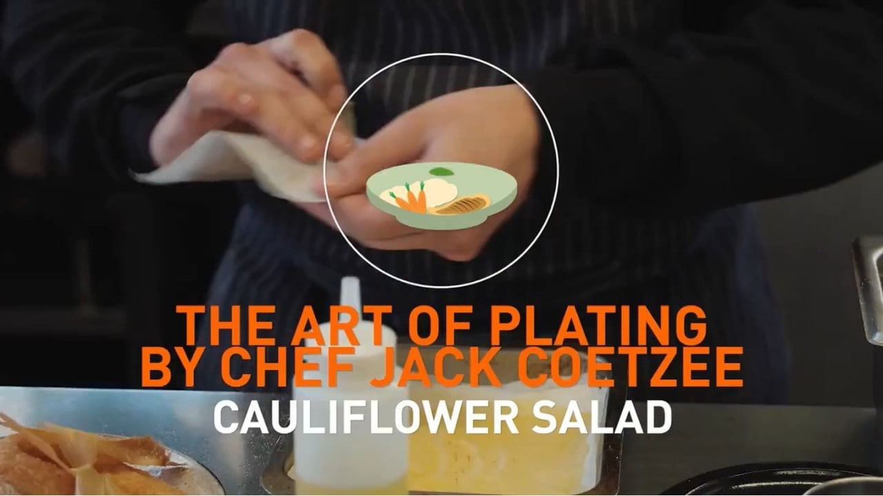 En utilisant un plat rectangulaire et des tons monochromes, le chef Coetzee montre comment préparer une salade de chou-fleur. Essayez de visualiser votre plat avant de le dresser et de créer des assiettes passionnantes.