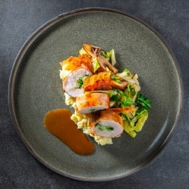 Pour préparer une roulade de coucou de Malines au Lardo et au chou vert, cuisez la saucisse de volaille enroulée et les garnitures dans un four à vapeur. Vous préserverez ainsi tous les jus de la volaille.