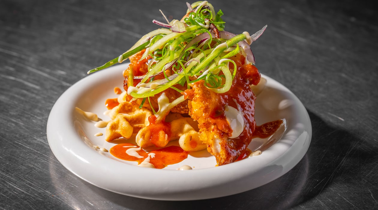 Chicken waffles : Tempura de poulet croustillante, sauce tomate spicy à l’estragon, mayonnaise fumée à l’érable et salade de concombre fraîche