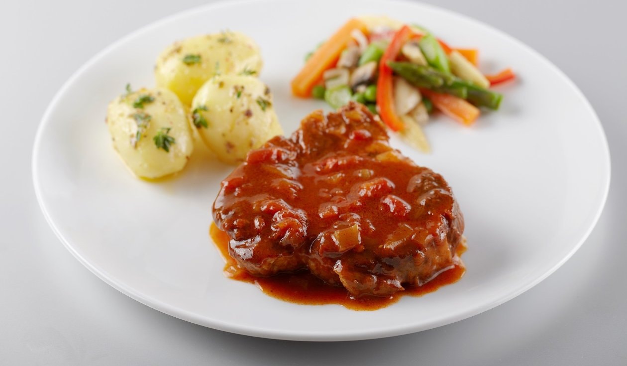 Côtelette braisée,salade de légumes et pommes de terre au saffran