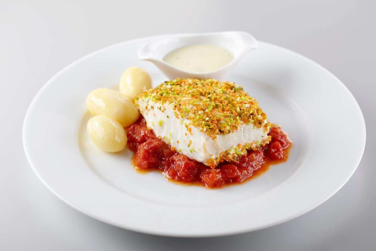 Filet de cabillaud, compote de tomates et sauce Noilly Prat