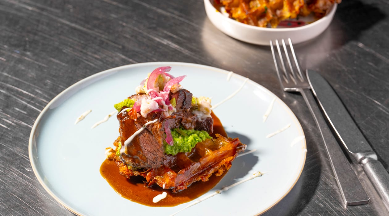Gaufre de pomme de terre au short rib de bœuf braisé, romanesco et chou-fleur marinés