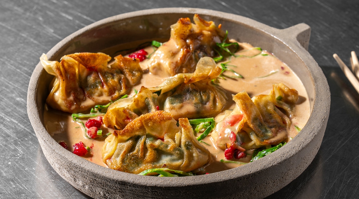 Gyozas au chou frisé, aux canneberges et à la sauce au porto