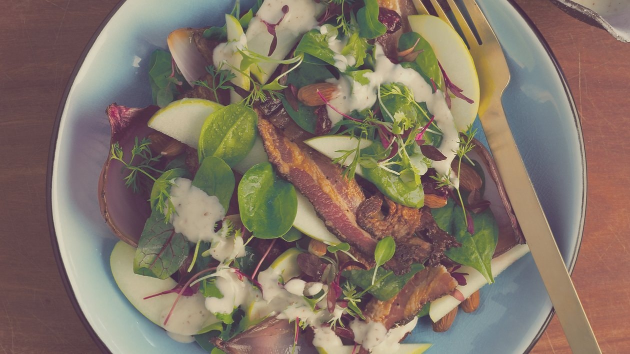 Lard chaud, oignon rouge, salade d'épinards, dressing