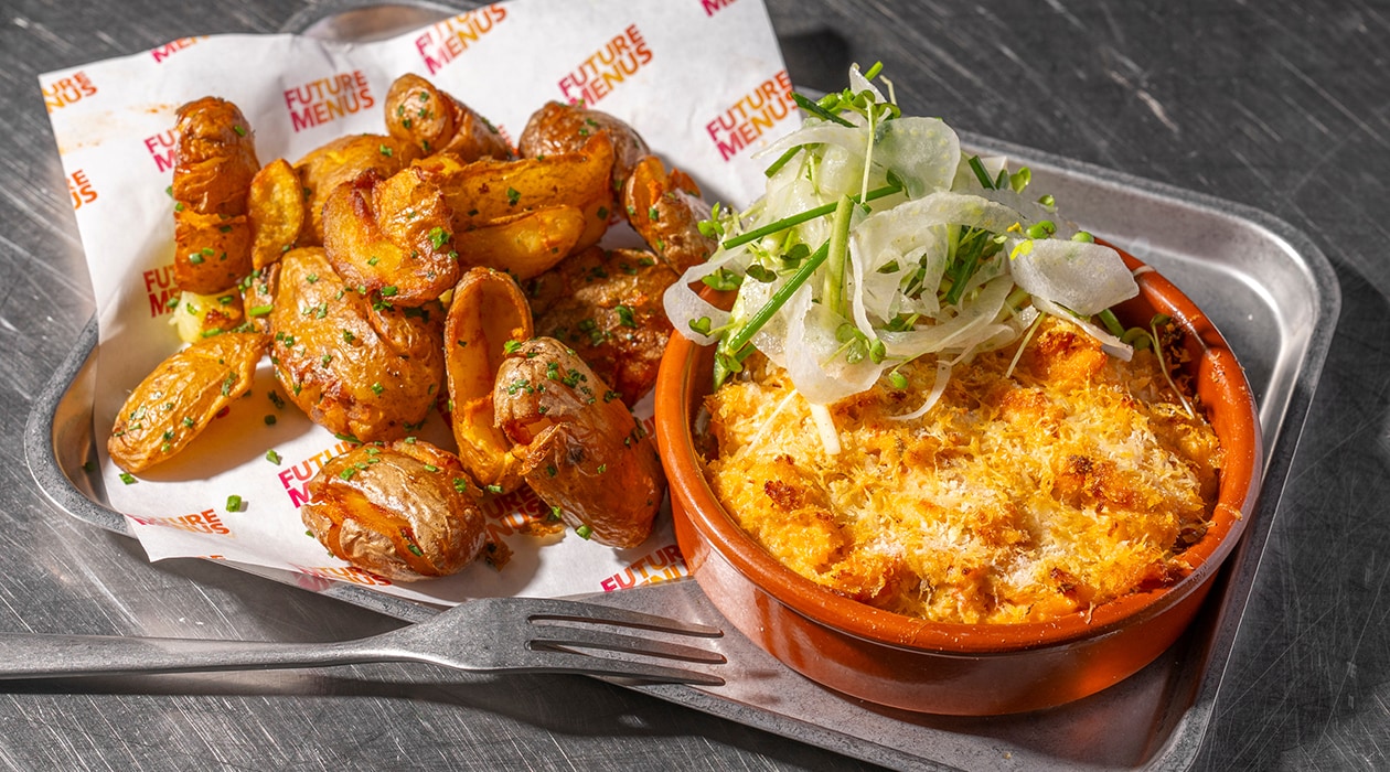 Parmentier de saumon et de crabe des neiges avec grenailles croustillantes