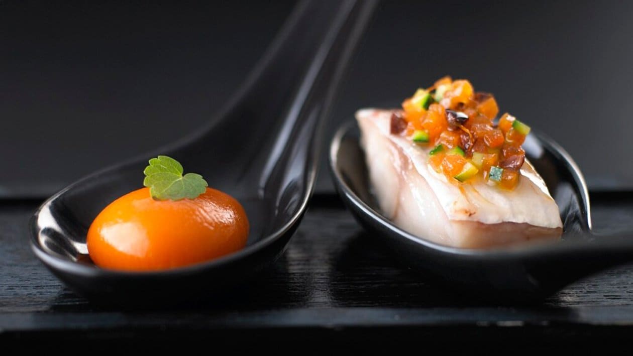 Ravioli de poivron rouge, grondin perlon et légumes marinés