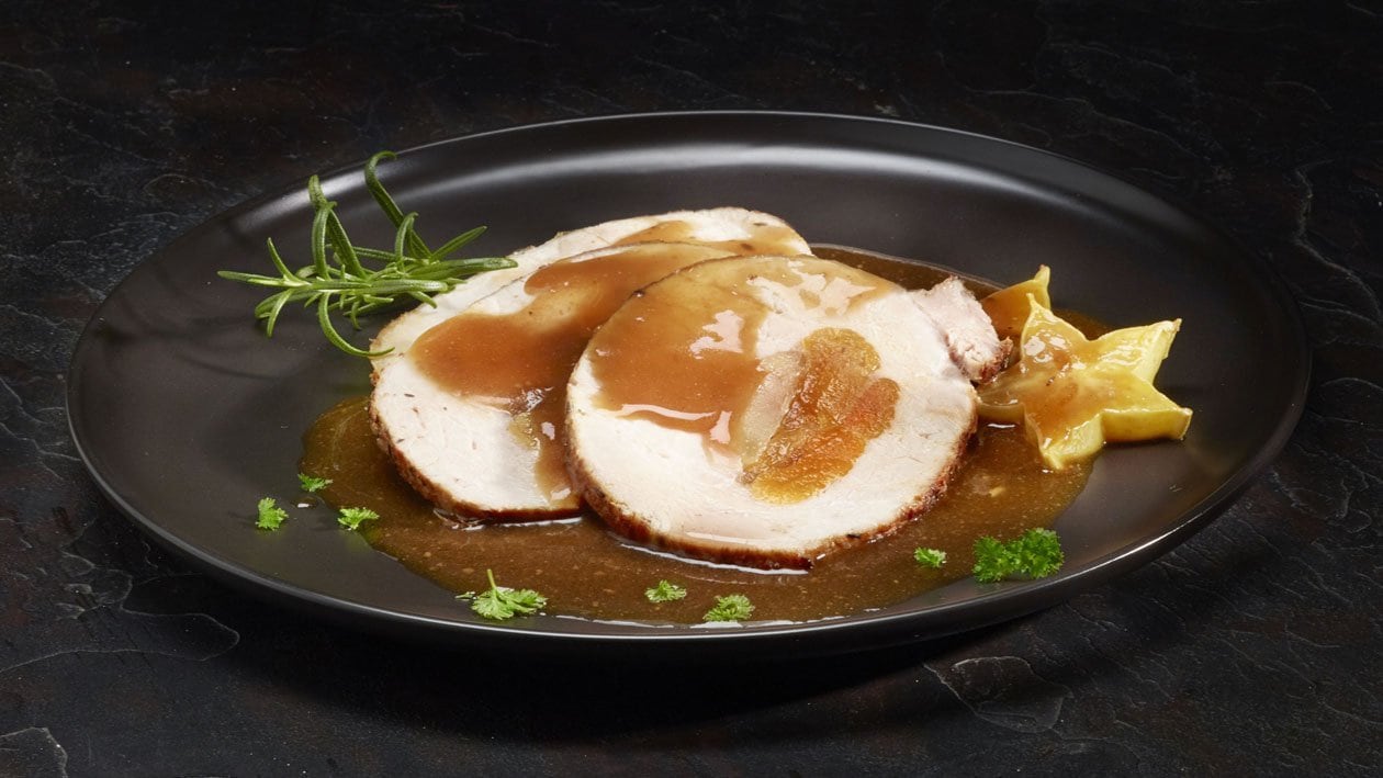 Rôti de lombes de porc au gingembre confit et abricots secs