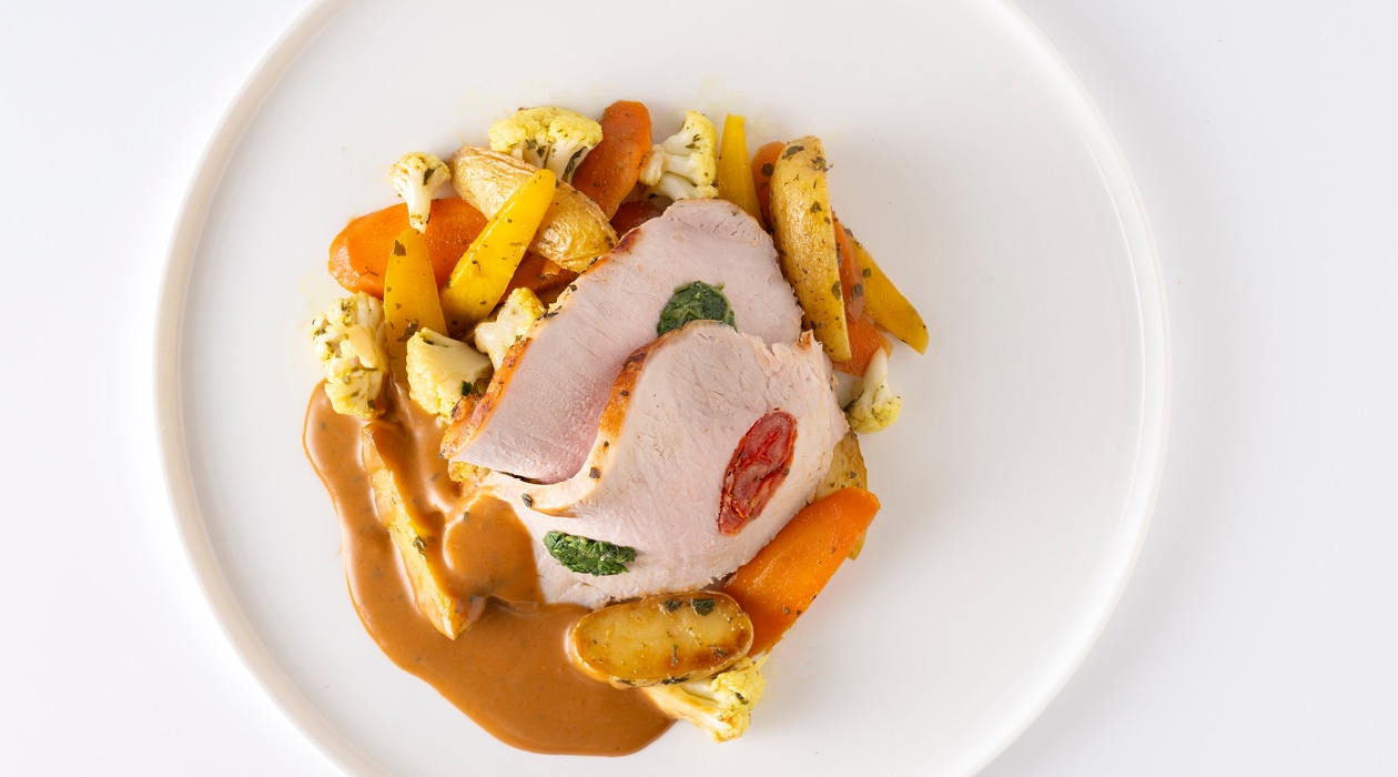 Rôti de porc à l’italienne, légumes grillés et grenailles