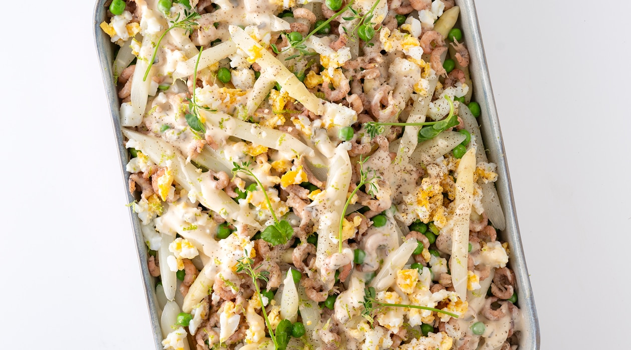 Salade d’asperges blanches aux petits pois, vinaigrette aux crevettes