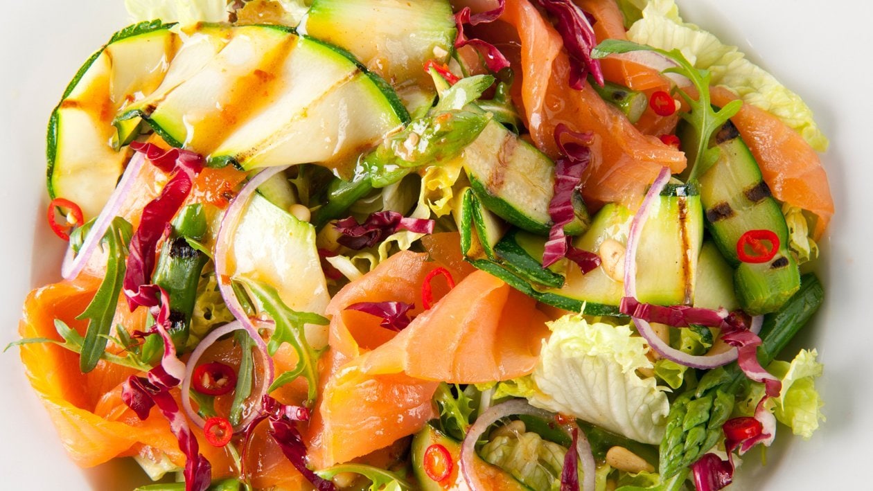 Salade de courgettes, saumon fumé et vinaigrette jalapeno-gingembre