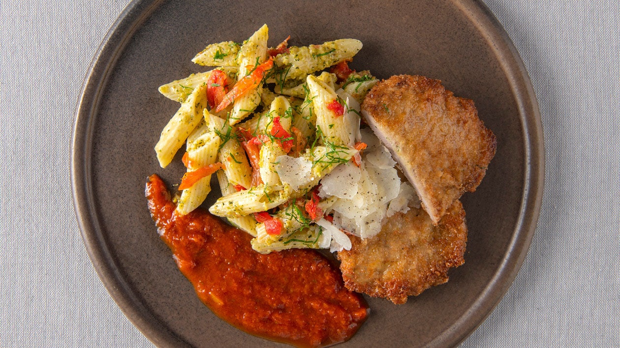 Sauté de porc pané, tomate-basilic, penne et pesto de brocoli