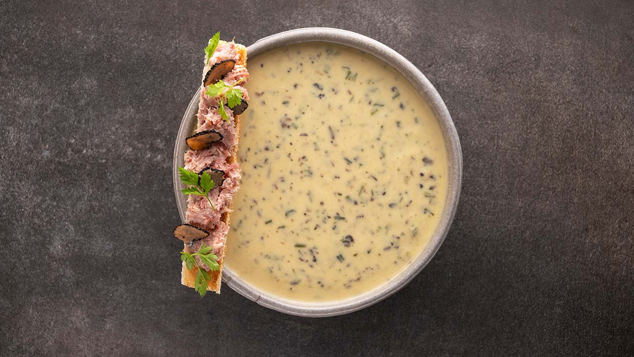 Soupe de truffes au mascarpone et toast aux rillettes d’oie