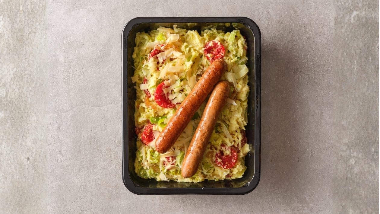 Stoemp de printemps aux poireaux, au curry et aux merguez