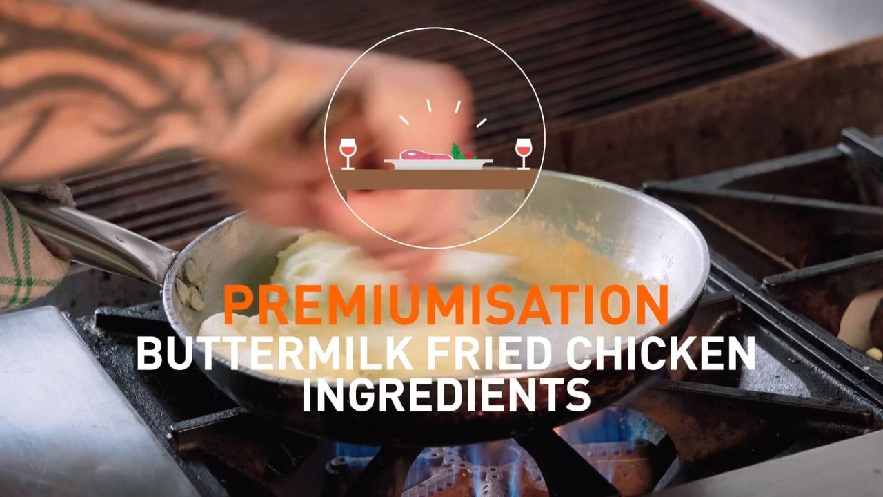 Maak kennis met de ingrediënten voor het eerste gerecht – Gefrituurde kip met karnemelk met een glazuur van honing en frieten met een kruidenmix.