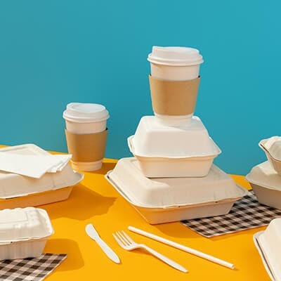 - Meeneemgerechten presenteren mooi in schalen en kommen van bagasse of palmblad. Palmblad is 100% composteerbaar, olie- en waterbestendig en kan zowel in de gewone (tot 220 °C) als in de microgolfoven (3 min.). Bagasse, gemaakt uit suikerrietpulp, is erg sterk en kan in de oven (220 °C), microgolfoven (10 min.) én in de diepvries.
