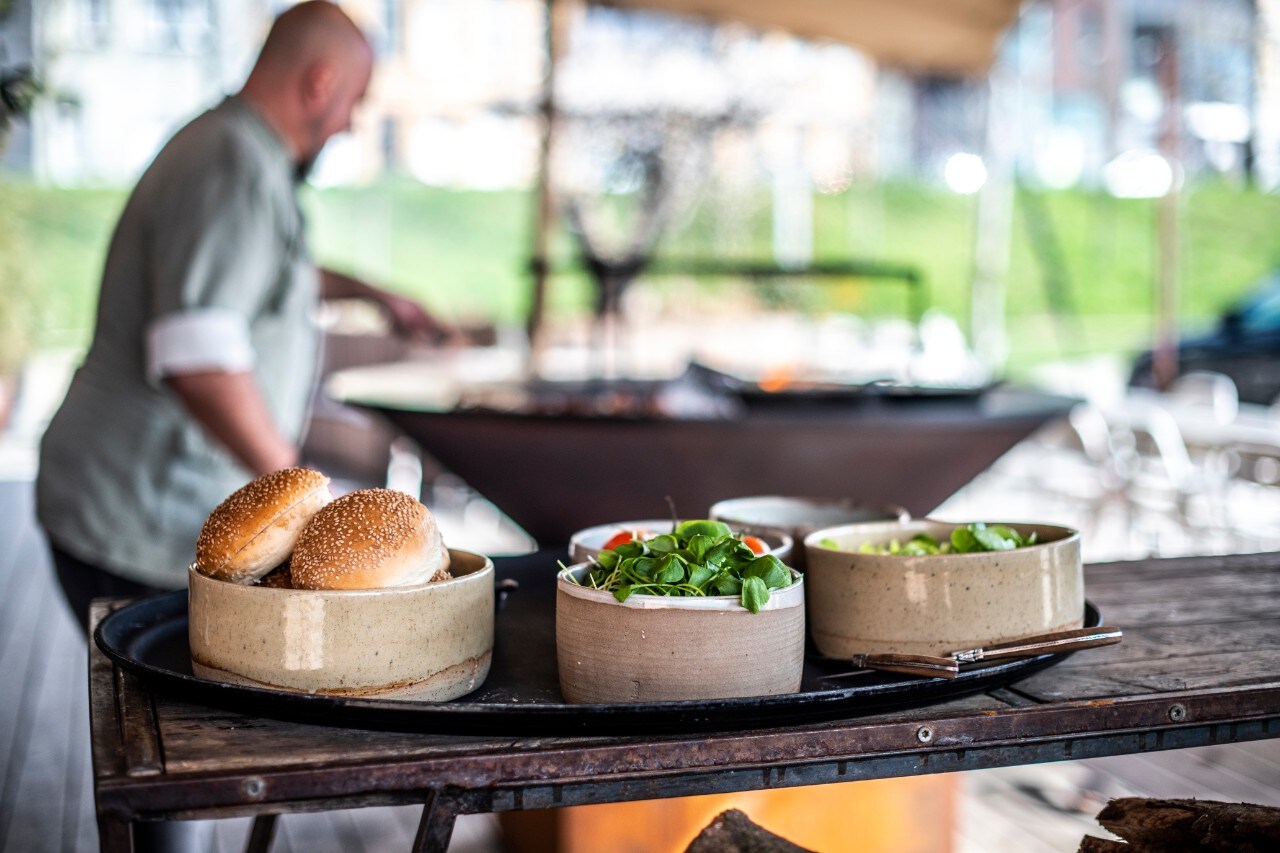 Maar Jimmy zweert bij koken op open vuur. Braaien heeft zijn voorkeur, dat geeft een heerlijke smaak aan gerechten én veel beleving. Maar voor catering op locatie is zijn braai veel te groot. Daarom bereidt hij de meeste gerechten op zijn Ofyr. Deze kegelvormige vuurschaal heeft een brede, platte rand die je gebruikt als tepanyaki of bakplaat. Het hout verspreidt zijn warmte met een vloeiend verloop vanuit het midden, zodat de plaat meerdere kooktemperaturen krijgt.