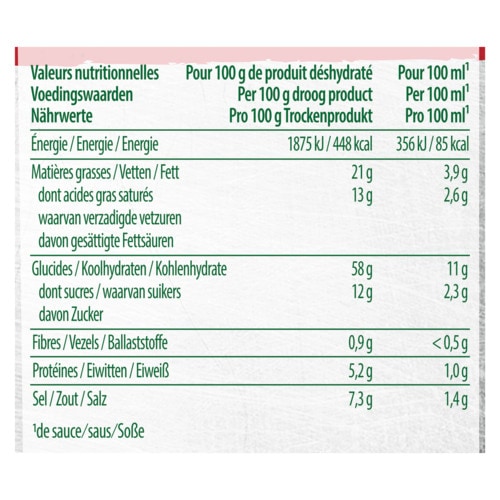 Bereiding op basis van boter (BOTER 16%, magere MELK), maltodextrine, gemodificeerd zetmeel, witte wijnextract, zoete maïs, aroma's (bevat MELK), zout, WEIPRODUCT, palmvet, suiker, zetmelen, LACTOSE, TARWEBLOEM, rijsmiddelen (E500, E331, E170), appelpulp, citroensap 0,7%, voedingszuur (citroenzuur), gistextract, geconcentreerd wortelsap, kurkuma. Kan ROGGE, GERST, HAVER, EI, SOJA, SELDERIJ, MOSTERD bevatten. Geschikt voor vegetariërs.
