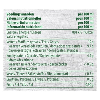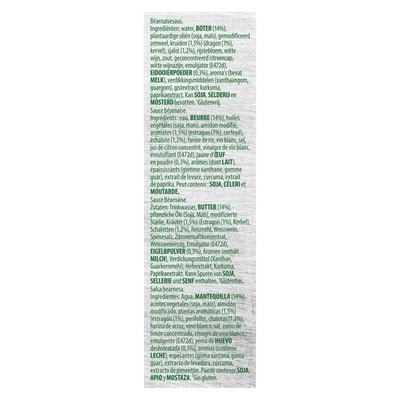 Water, BOTER (14%), plantaardige oliën (soja, maïs), gemodificeerd maïszetmeel, kruiden (1,3%) (dragon (0,8%), kervel), sjalot (1,2%), rijstebloem, witte wijn, zout, citroensapconcentraat, witte wijnazijn, emulgator (E472e), EIGEELPOEDER (0,3%), verdikkingsmiddelen (xantaangom, guargom), gistextract, aroma's, kurkuma, natuurlijk paprika-extract, natuurlijk peperaroma. Kan gluten en selderij bevatten.