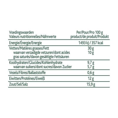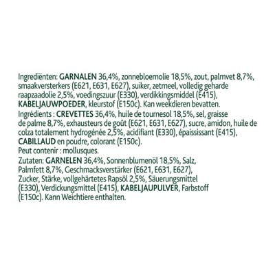 GARNALEN 36,4%, zonnebloemolie 18,5%, zout, palmvet 8,7%, smaakversterkers (E621, E631, E627), suiker, zetmeel, volledig geharde raapzaadolie 2,5%, voedingszuur (E330), verdikkingsmiddel (E415), KABELJAUWPOEDER, kleurstof (E150c). Kan weekdieren bevatten