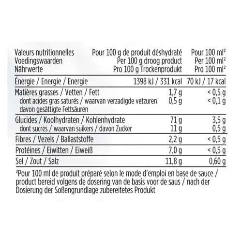 • Deze smaakmaker start droog, maar is makkelijk en snel oplosbaar.