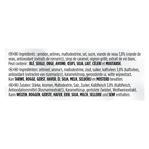 Zetmeel, aroma's, maltodextrine, zout, suiker, kalfsvlees 3,8% (kalfsvlees, antioxidant (extracten van rozemarijn)), karamelstroop, geroosterde ui, witte wijnextract. Kan TARWE, ROGGE, GERST, HAVER, EI, SOJA, MELK, SELDERIJ en OSTERD bevatten.