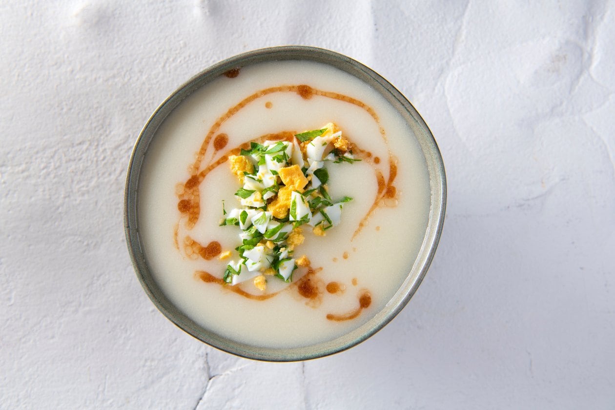 Aspergesoep met ei mimosa en peterselie, vinaigrette sjalot rode ui