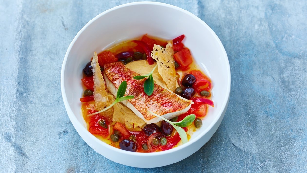 Gebakken mul, chorizocrème, chutney van tomaten, olijven, kappertjes