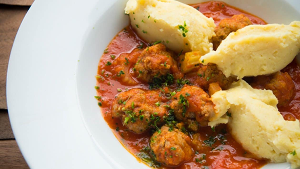 Gehaktballetjes in tomatensaus met bleekselderij en aardappelpuree