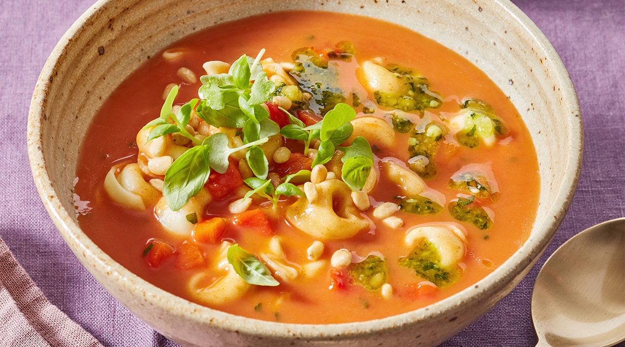 Italiaanse tomatensoep met tortellini, pesto en basilicum