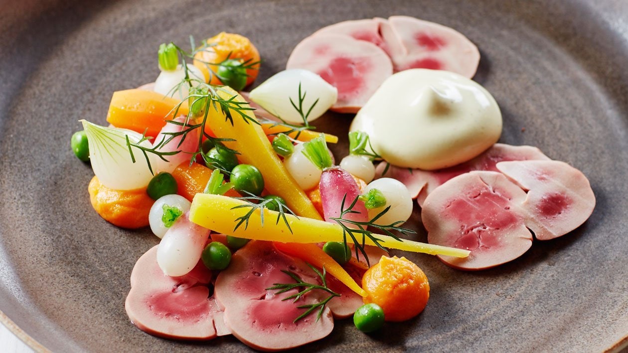 Kalfsniertjes met jonge groenten en mosterdsaus
