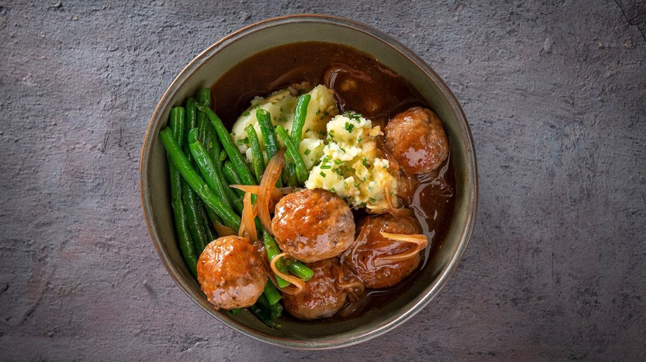 Lamsballetjes met een aardappel écrasé, boontjes en een jus van sjalot