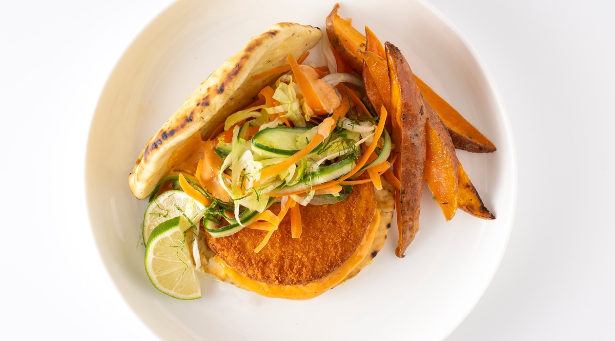 Oosterse NoChicken Burger met zoeteaardappelwedges en een kleurrijke salade