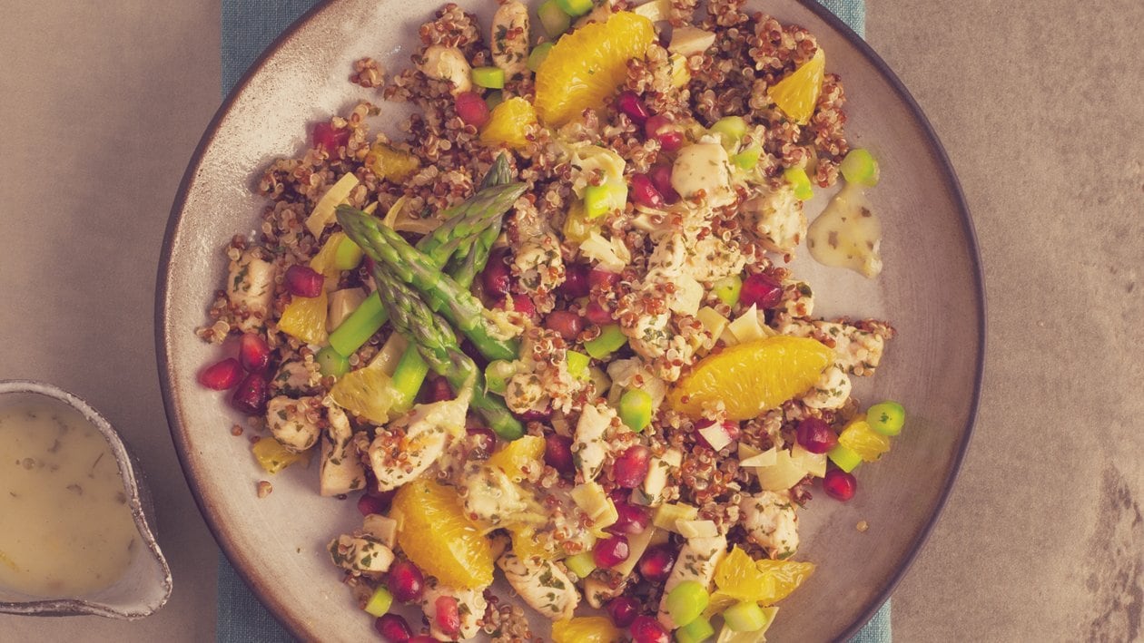 Salade van quinoa, kip en asperge met artisjok en granaatappel