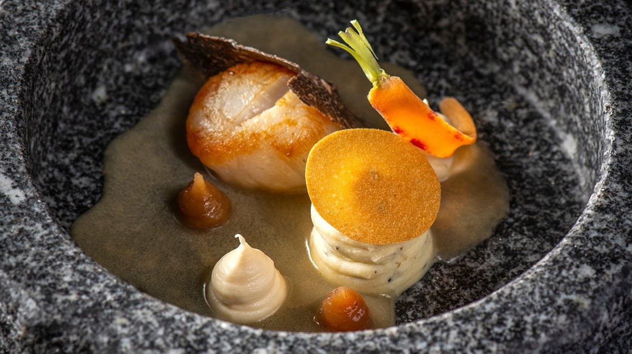 Sint-jakobsschelpen, peterseliewortel en uienbouillon