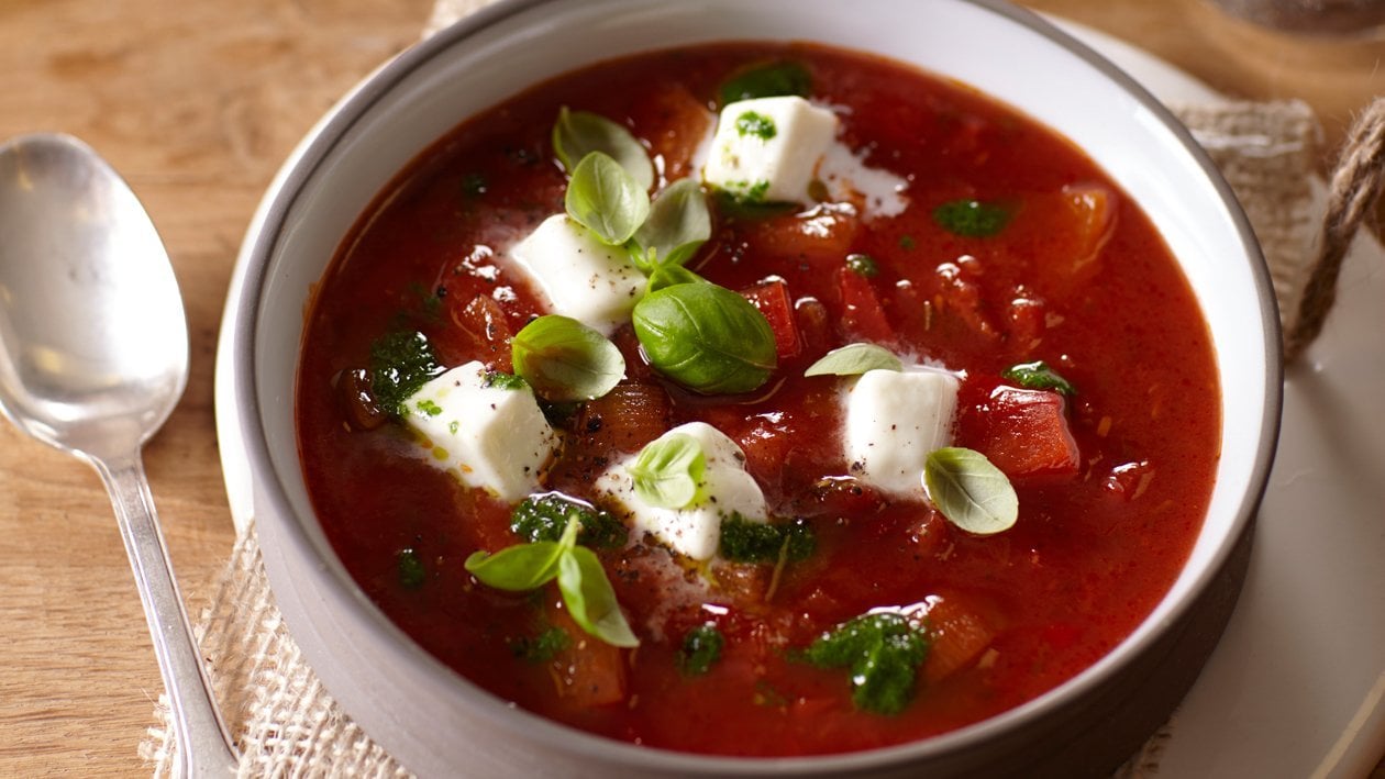Tomatensoep uit Toscane met mozzarella en basilicum