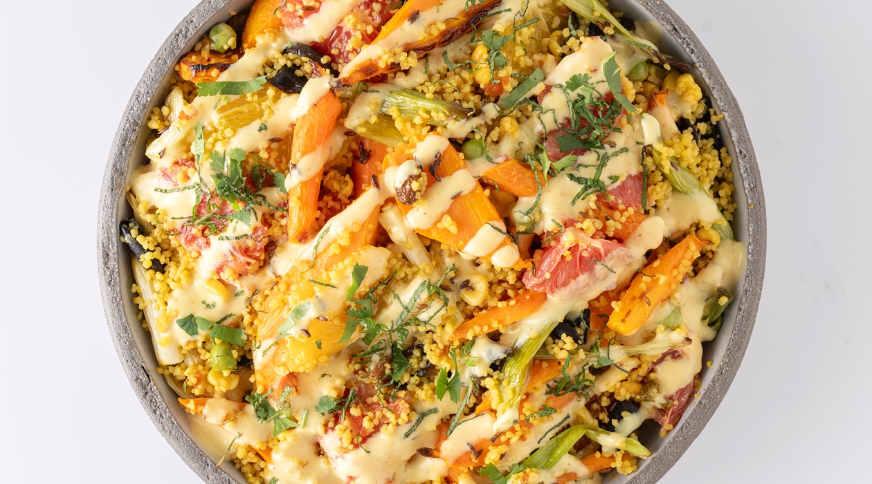 Verfrissende taboulésalade met geroosterde wortel en currydressing